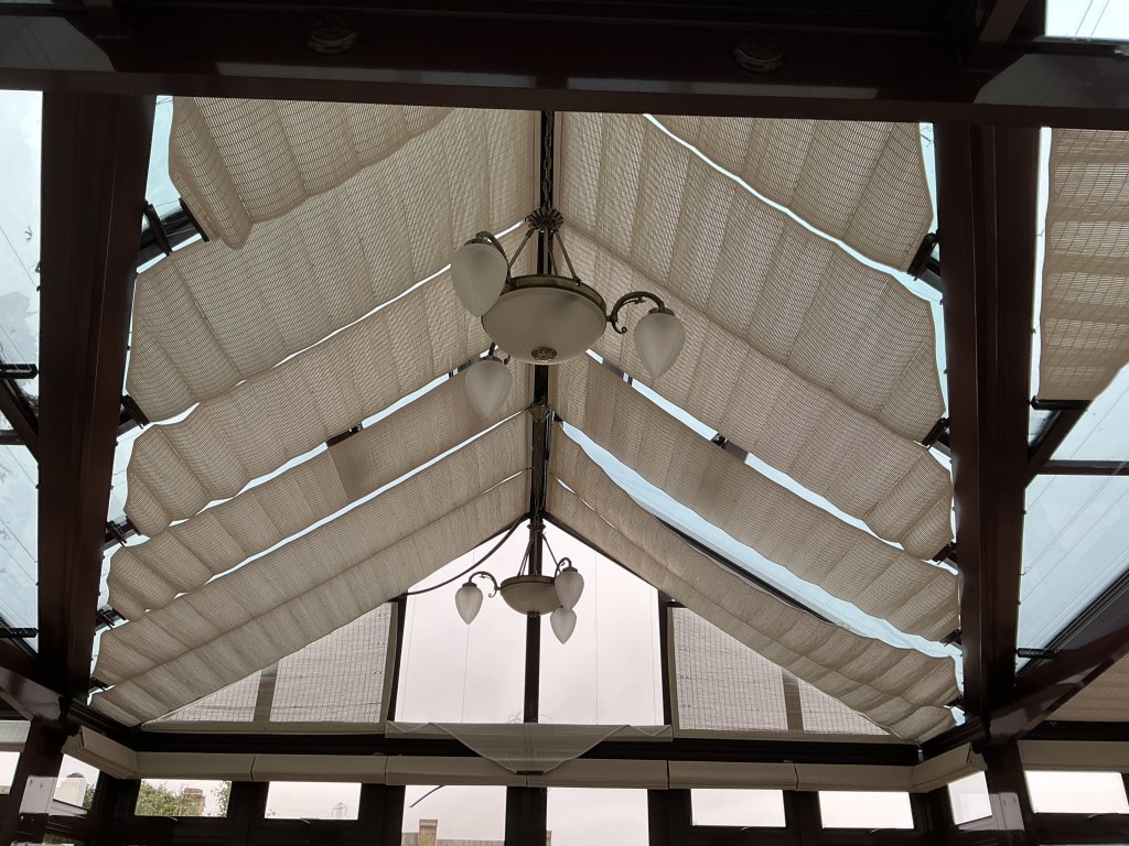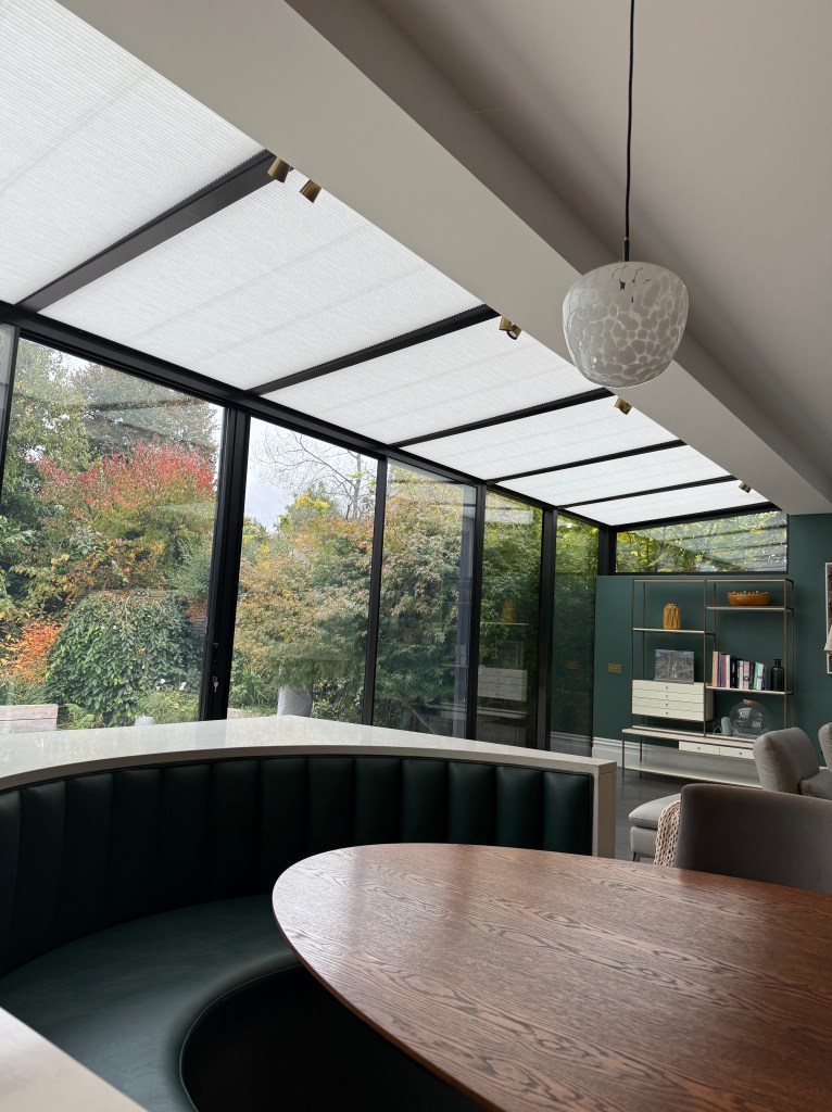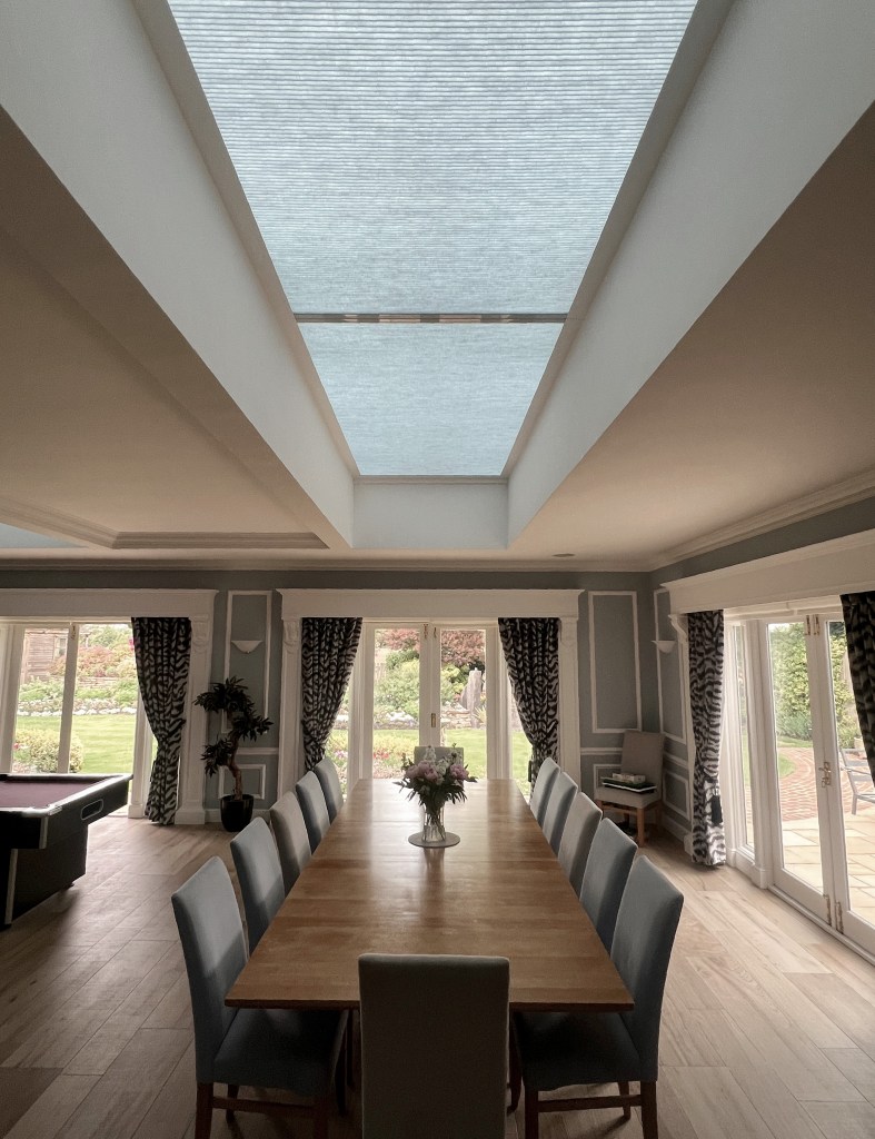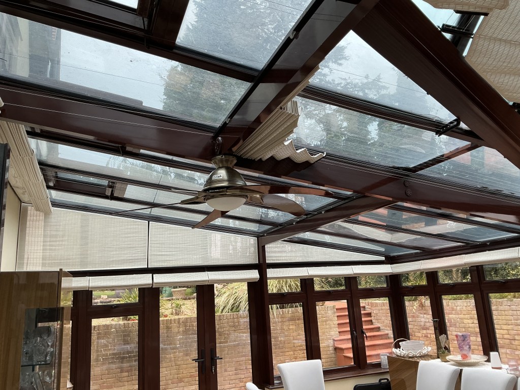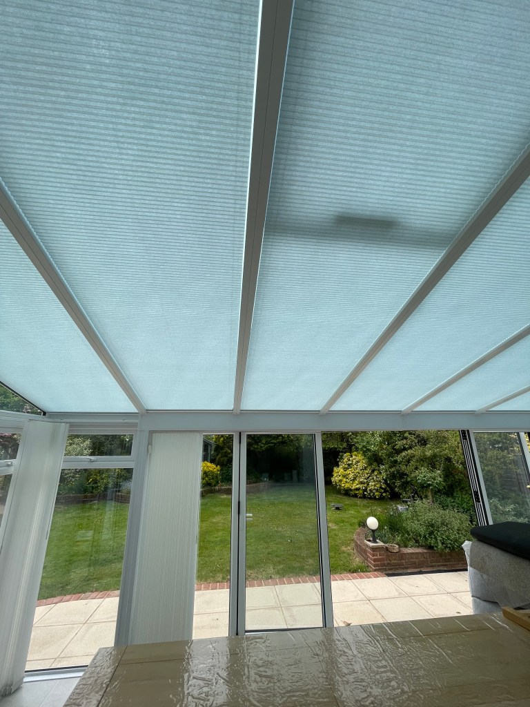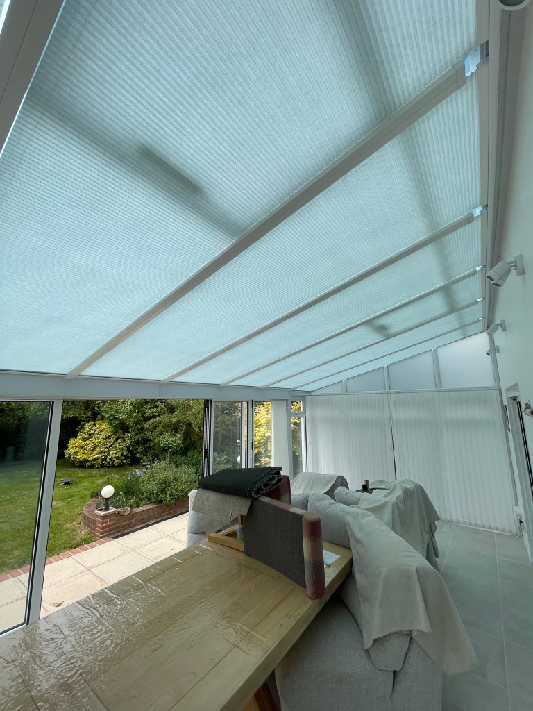 The large conservatory requires blind coverage to both the roof and windows and again the client has opted for motorised operation with our Solo Connect system.