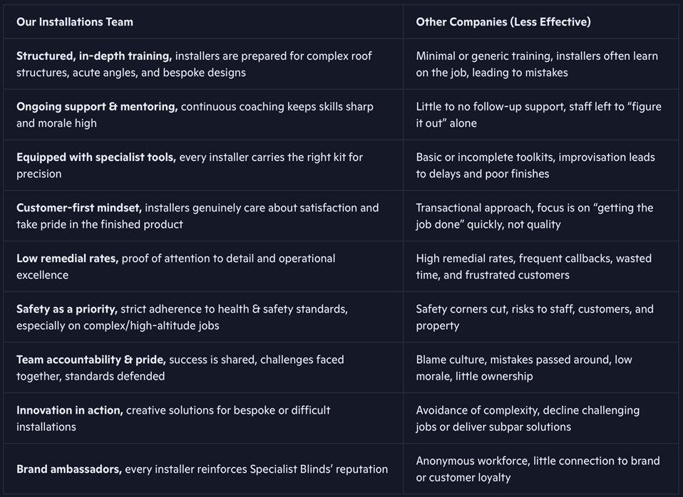 We also introduced the upcoming launch of our new 12v roof motor system, enabling us to supply and install conservatory roof blinds with a fully integrated low‑voltage solution. No other company in the industry is offering this technology, giving us a clear competitive advantage and keeping us years ahead of the market.