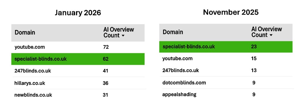 As reported in our November newsletter, we are constantly updating our websites to improve our visibility in Google’s search results. You will have noticed that when you use Google yourselves that the top results are often AI Overviews now, so we are pleased to see a huge increase in the number of times Google has used our website to help answer people’s questions. Not surprisingly, YouTube is now above us in the top five websites with visibility, but we are still beating all our competitors.